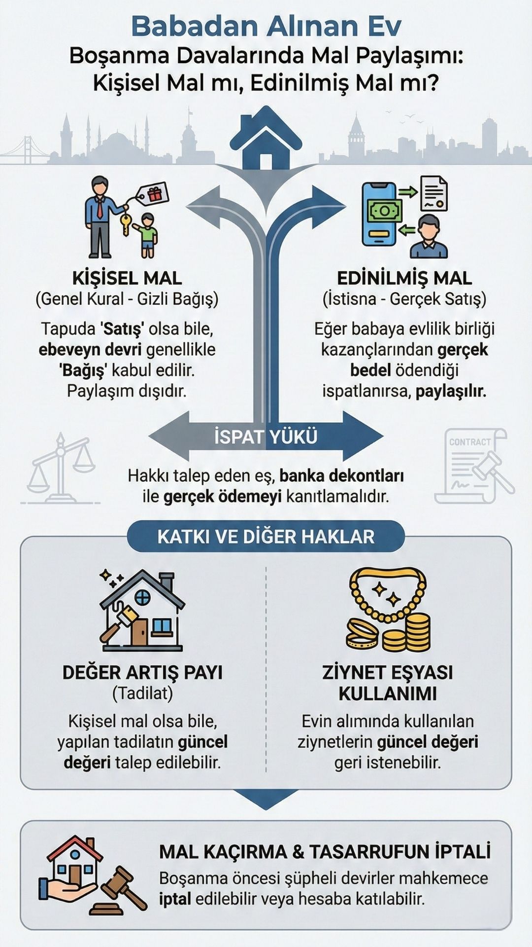 Uzman bir avukat bilirkişi raporundaki hatalı değerlendirmelere eksik hesaplamalara veya yanlış emsal kullanımlarına karşı etkili itirazlarda bulunarak raporun düzeltilmesini sağlar. İstanbul gibi metropollerde malvarlıkları sadece bir evden ibaret olmayıp şirket hisseleri döviz hesapları araçlar ve farklı gayrimenkuller içerebilir. Babadan alınan ev bu karmaşık yapının sadece bir parçası olabilir. Eşler arasındaki para transferlerinin izini sürmek gizlenen varlıkları ortaya çıkarmak ve babadan gelen malın gerçek niteliğini ispatlamak ileri düzeyde hukuki bilgi ve tecrübe gerektirir. Sadece dava açmakla kalmayıp sürecin başında Mal Rejimi Sözleşmesi yapılması dava sırasında İhtiyati Tedbir alınması ve dava sonunda İlamın İcrası aşamalarında müvekkillerine stratejik rehberlik sunmak ancak profesyonel bir hukuki destekle mümkündür.