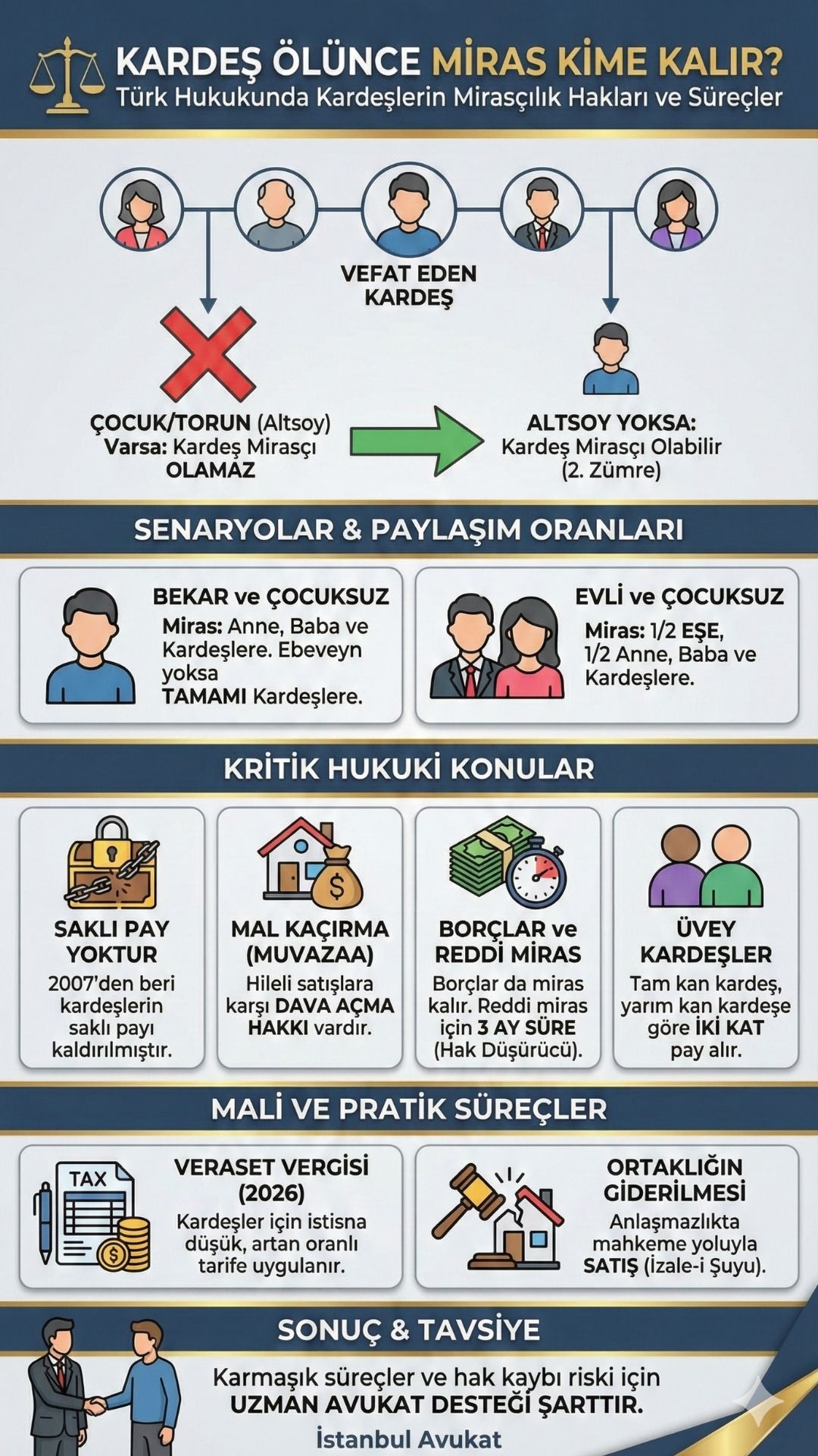 Özetlemek gerekirse, kardeş ölümü sonrası miras paylaşımı, kişinin medeni durumu, çocuk sahibi olup olmaması ve ebeveynlerinin hayatta olup olmamasına göre şekillenen çok boyutlu bir süreçtir. Yasal mirasçıların belirlenmesi, saklı pay haklarının gözetilmesi, muvazaalı işlemlerin iptali ve vergi yükümlülüklerinin yerine getirilmesi, derinlemesine hukuki bilgi ve tecrübe gerektirir. Sürecin her aşamasında yapılabilecek küçük bir hata, telafisi güç hak kayıplarına yol açabilir. Özellikle İstanbul gibi büyük şehirlerde gayrimenkul değerlerinin yüksekliği, miras ihtilaflarını daha karmaşık hale getirmektedir. Bu karmaşık süreçte haklarınızı tam ve eksiksiz alabilmek, miras paylaşımını adil bir şekilde gerçekleştirmek ve olası risklerden korunmak için alanında uzman bir Avukat İstanbul bölgesinde en büyük yardımcınız olacaktır.